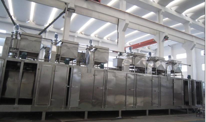 物料由加料器均勻地鋪在帶式干燥機(jī)、脫水蔬菜干燥機(jī)網(wǎng)帶上,網(wǎng)帶一般采用12-60目不銹鋼絲網(wǎng),由傳動(dòng)裝置拖動(dòng)在干燥機(jī)內(nèi)移動(dòng)。帶式干燥機(jī)由若干單元組成,每一單元熱風(fēng)獨(dú)立循環(huán),部分尾氣由專門排濕風(fēng)機(jī)排出,廢氣由調(diào)節(jié)閥控制,熱氣由下往上或由上往下穿過鋪滿物料的網(wǎng)帶完成熱量與質(zhì)量傳遞的進(jìn)程,帶走物料水份。網(wǎng)帶緩慢移動(dòng),運(yùn)行速度可根據(jù)物料溫度自由調(diào)節(jié),干燥后的成品連續(xù)落入收料器中。帶式干燥機(jī)、脫水蔬菜干燥機(jī)上下循環(huán)單元根據(jù)用戶需要可靈活配備,單元數(shù)量亦可根據(jù)需要選取。